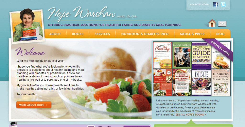 Great question! Nothing makes my day more than when a client, reader of one of my books or colleague says something like, “I just love your realistic, down-to-earth and practical suggestions for healthy eating.” That’s whether I’m talking about managing type 1 or type 2 diabetes or offering advice for more healthful choices at restaurants. I describe myself in this profile: http://www.hopewarshaw.com/about_hope